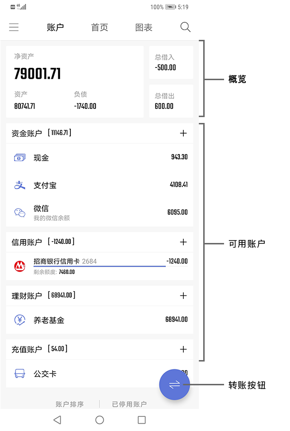 4资金账户:支持现金,银行卡,支付宝,微信,QQ钱包及其他类型资金账户