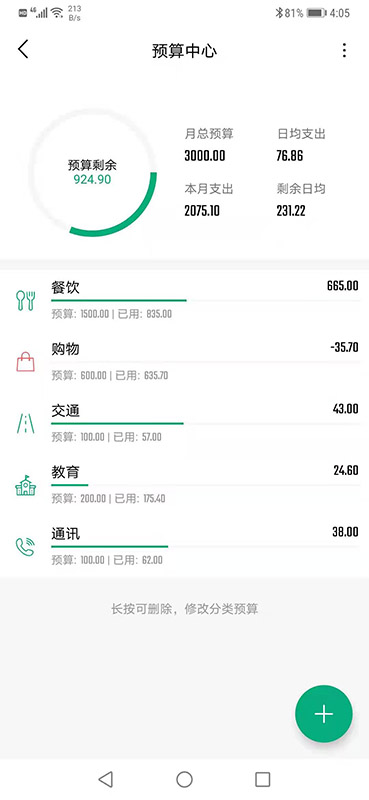 - 预算剩余:月总预算-本月支出(当支出超出预算时为预算超支)