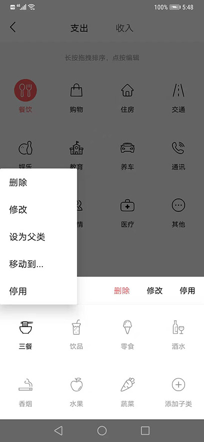 个性化我的分类 汤圆记账为您预置了一些分类,同时您也可以按自己的习惯定制。 分类管理 点击支出,收入切换分类类型 点击右下角”+”号创建新的分类 点击分类打开分类详情,可在详情上方删除,修改,启用/停用分类 详情下方为该分类的子分类,同样可以点击子类编辑或添加一个子类 默认所有子分类均为不启用的状态,您可以点按子分类并启用他们 长按拖拽分类排序 删除分类将会连带删除该分类及子分类下所有账单