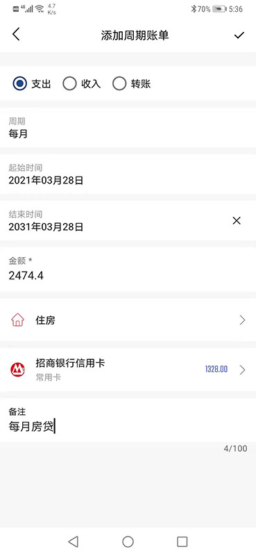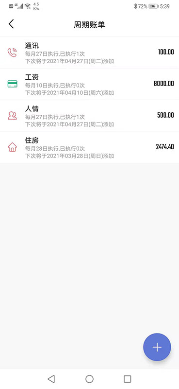 周期账单房贷,车贷,网费等每月固定支出,手动记太麻烦,周期账单来帮您。 如何使用周期账单您可以在主页打开侧边栏 -> 点击周期账单进入。 点击右下角添加按钮添加一个周期账单。 按您的需要设置好账单参数,点击保存。之后系统就会自动按照您的设置自动生成账单啦。