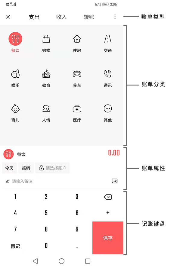 - 我们为您预置了一些默认分类,点击即可选择相应的账单分类。
